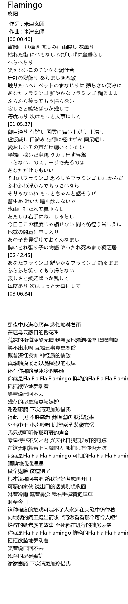 | [00:43.51] | あなたフラミンゴ 鮮やかなフラミンゴ 踊るまま |