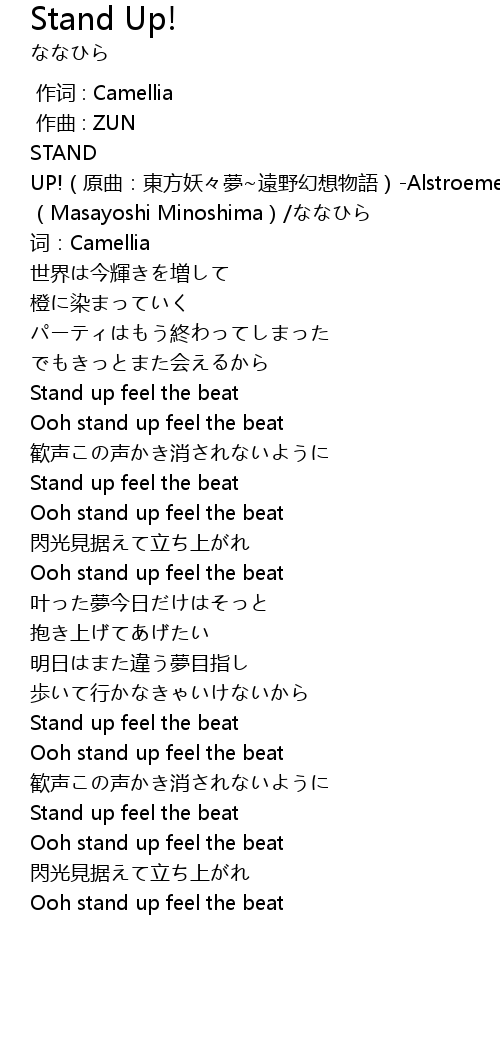 | [00:00.171] | STAND UP! yuan qu: dong fang yao meng yuan ye huan xiang wu yu Alstroemeria Records Masayoshi Minoshima |