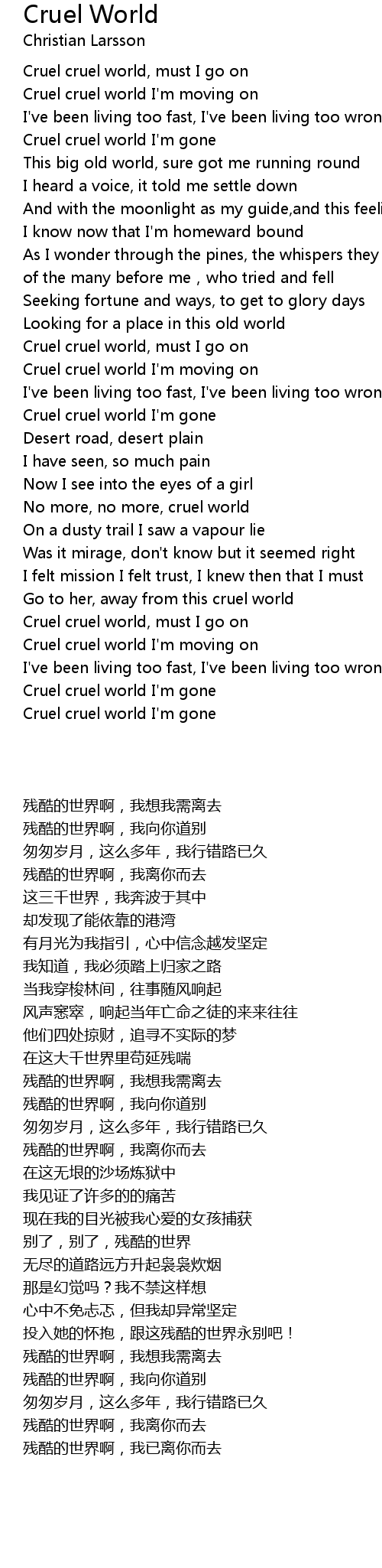 | [01:40.100] | Cruel cruel world I' m moving on |