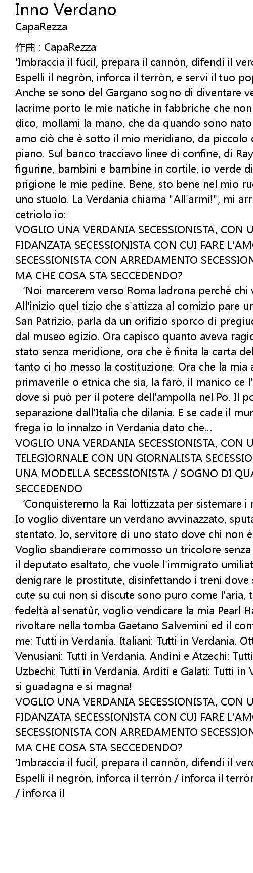 | Io voglio diventare un verdano avvinazzato, sputare parlando un italiano stentato. Io, servitore di uno stato dove chi non è come me viene discriminato. Voglio sbandierare commosso un tricolore senza bianco, né rosso. Voglio lodare il deputato esaltato, che vuole l' immigrato umiliato e percosso . Voglio denigrare le prostitute, disinfettando i treni dove sono sedute. Questione di cute su cui non si discute sono puro come l' aria, tutta salute. Voglio giurare fedeltà al senatù r, voglio vendicare la mia Pearl Harbour. Roba da fare rivoltare nella tomba Gaetano Salvemini ed il conte di Cavour. Allora fate come me: Tutti in Verdania. Italiani: Tutti in Verdania. Ottomani: Tutti in Verdania. Venusiani: Tutti in Verdania. Andini e Atzechi: Tutti in Verdania. Kazachi ed Uzbechi: Tutti in Verdania. Arditi e Galati: Tutti in Verdania, dove si lavora si guadagna e si magna! | |