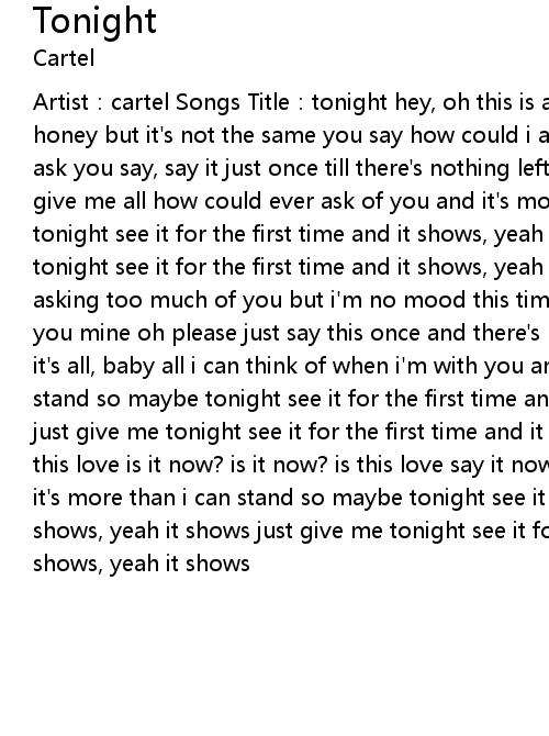 | [00:01.72] | Artist: cartel Songs Title: tonight hey, oh this is another one honey but it' s not the same you say how could i ask you? oh ccccome on let me ask you say, say it just once till there' s nothing left to be said give me all, give me all how could ever ask of you and it' s more than i can stand so maybe tonight see it for the first time and it shows, yeah it shows just give me tonight see it for the first time and it shows, yeah it shows so, maybe this is asking too much of you but i' m no mood this time and i' m thinking ' bout making you mine oh please just say this once and there' s nothing else to be said and it' s all, baby all i can think of when i' m with you and it' s more than i can stand so maybe tonight see it for the first time and it shows, yeah it shows just give me tonight see it for the first time and it shows, yeah it shows is this love is it now? is it now? is this love say it now, come on say it now and it' s more than i can stand so maybe tonight see it for the first time and it shows, yeah it shows just give me tonight see it for the first time and it shows, yeah it shows |