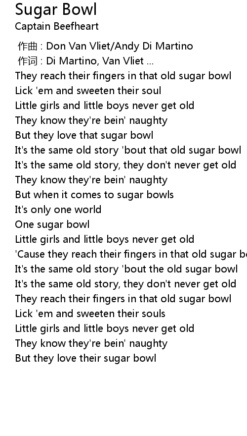 | [00:44.518] | It's the same old story 'bout that old sugar bowl |