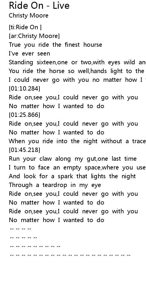| [01:26.366] | Ride on, see you, I could never go with you |