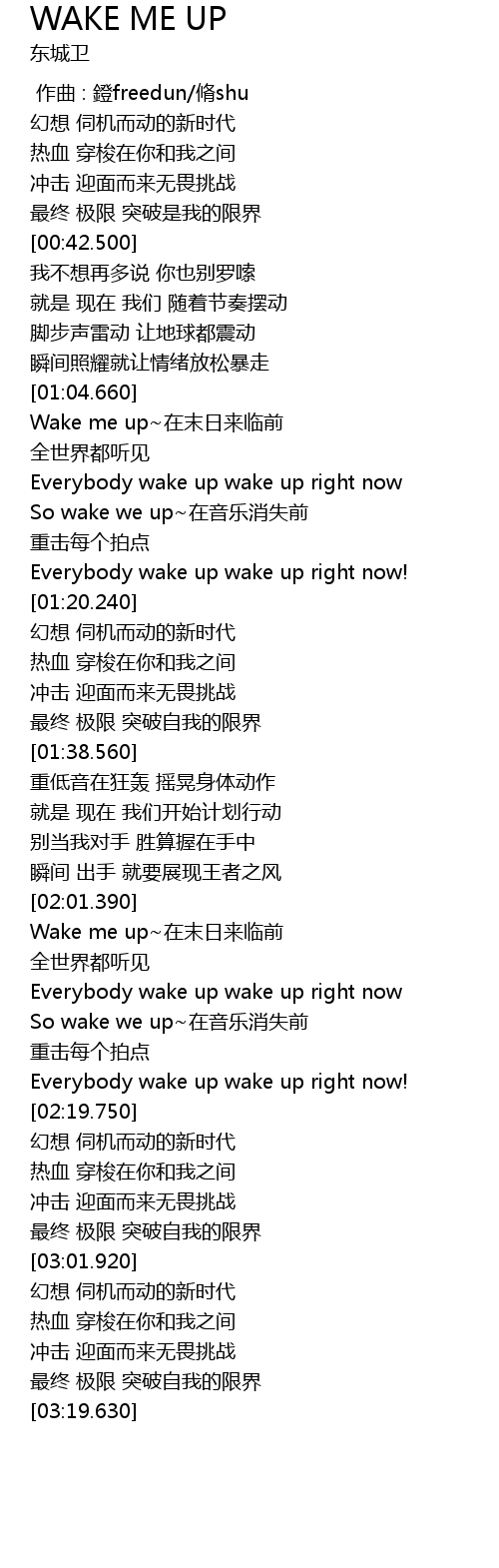 | [02:02.100] | Wake me up zài mò rì lái lín qián |