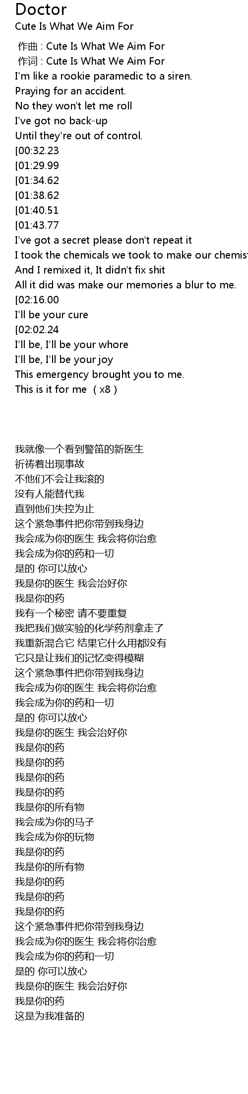 | [02:40.75][01:40.51][00:52.74] | I'm your doctor, I'm your cure. |