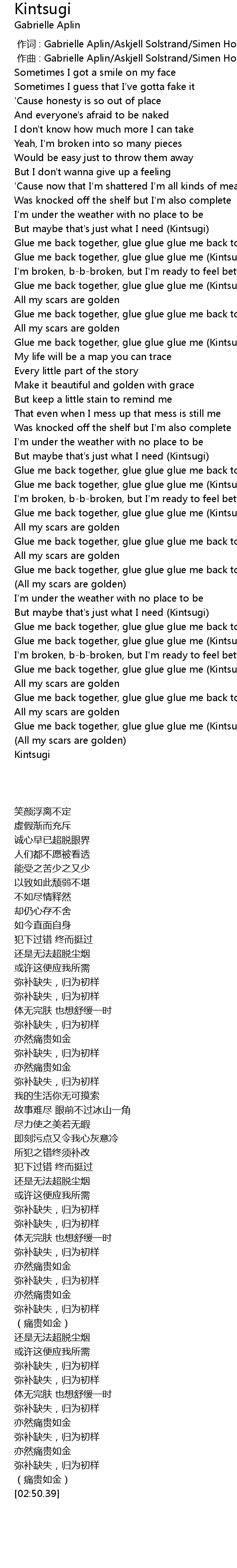 | [00:47.61] | Glue me back together, glue glue glue me Kintsugi |