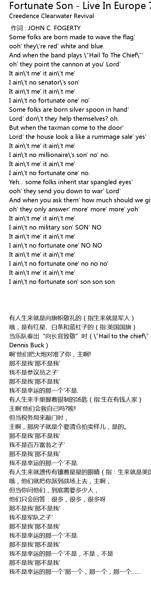 | [02:11.000] | I ain\'t no fortunate son' son son son |