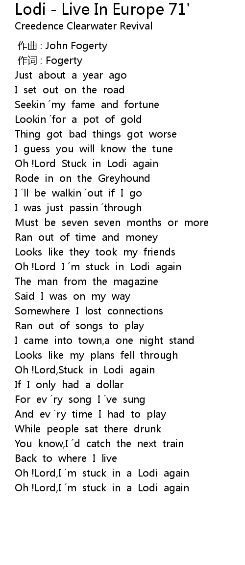 | [02:33.319] | Oh !Lord,I ´m stuck in a Lodi again |