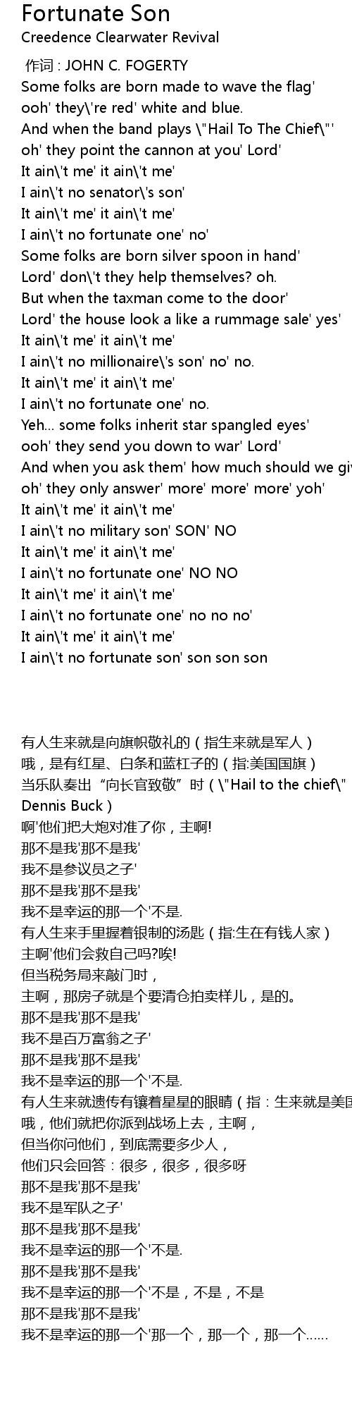 | [02:11.000] | I ain\'t no fortunate son' son son son |