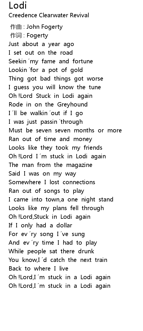 | [02:33.319] | Oh !Lord,I ´m stuck in a Lodi again |
