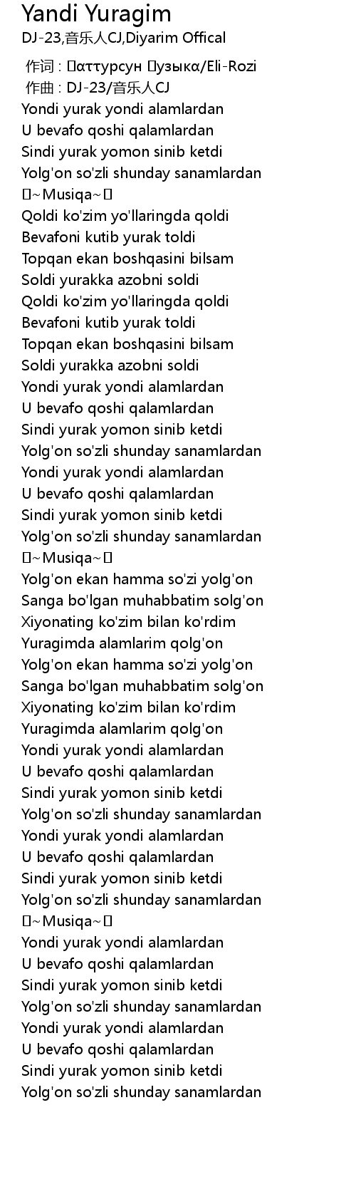 | [01:39.98] | Yolg' on ekan hamma so' zi yolg' on |
