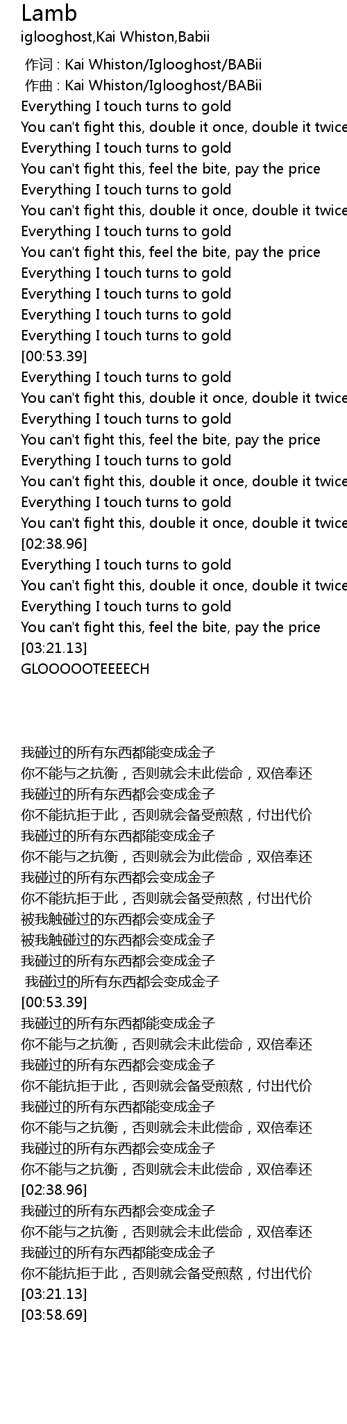 | [00:38.81] | 被我触碰过的东西都会变成金子 |