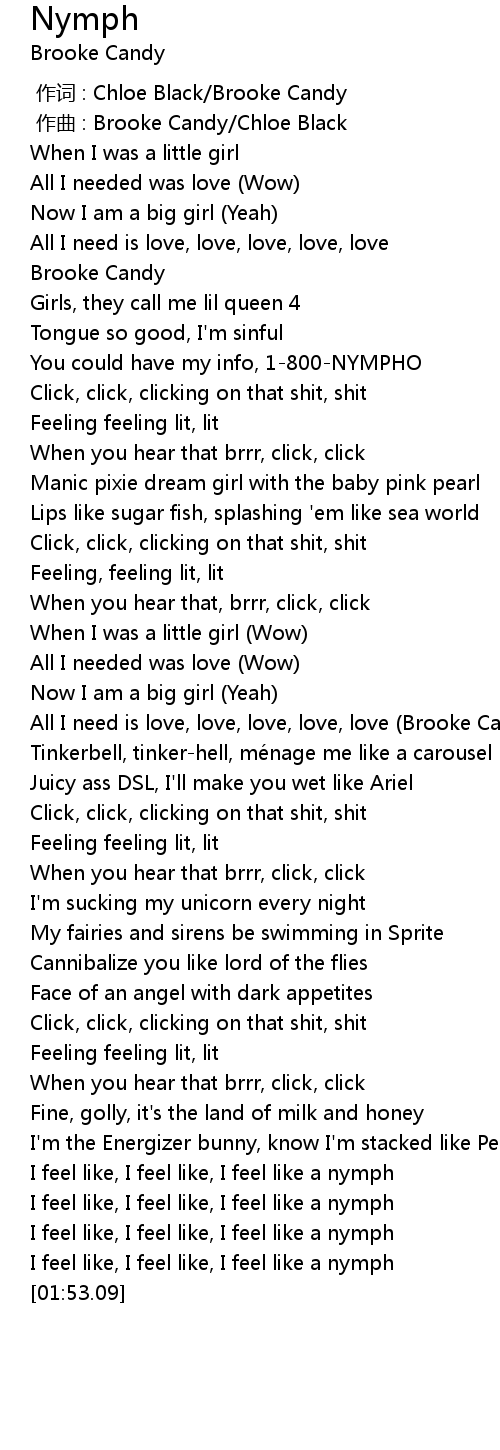 | [01:00.14] | All I need is love, love, love, love, love Brooke Candy |