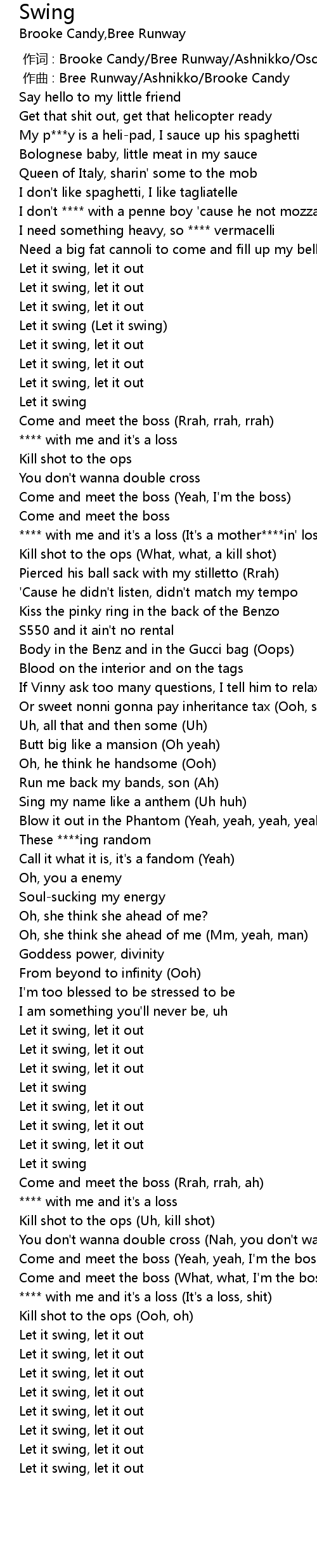 | [00:05.40] | My p***y is a heli-pad, I sauce up his spaghetti |