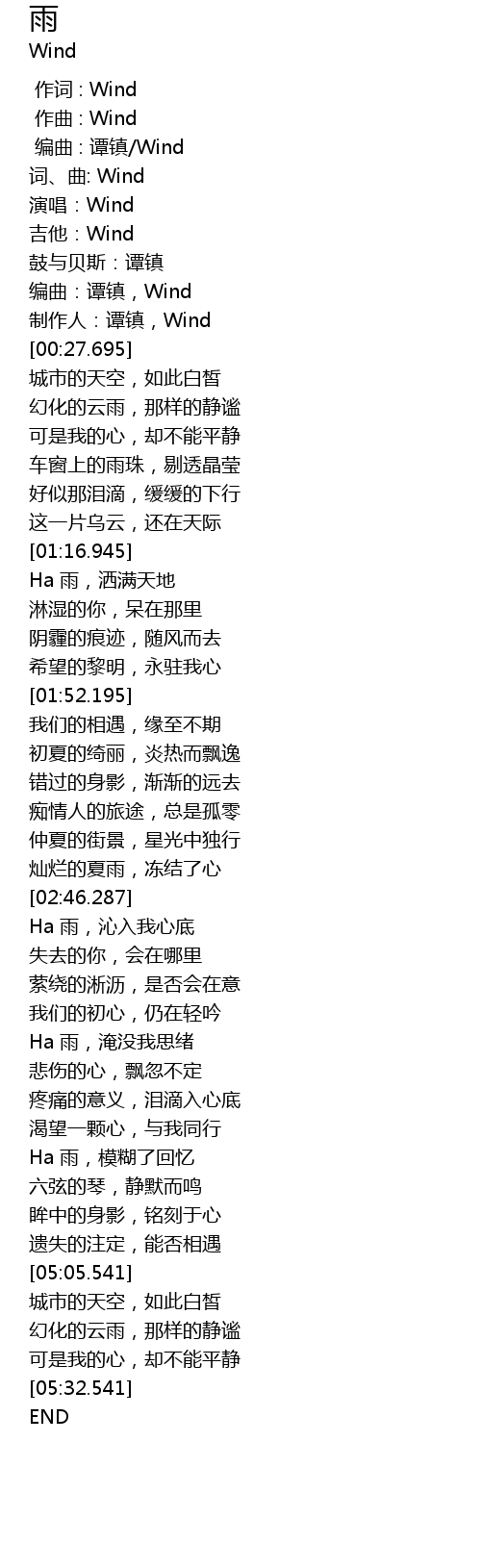 | [00:18.943] | 编曲:谭镇,Wind |