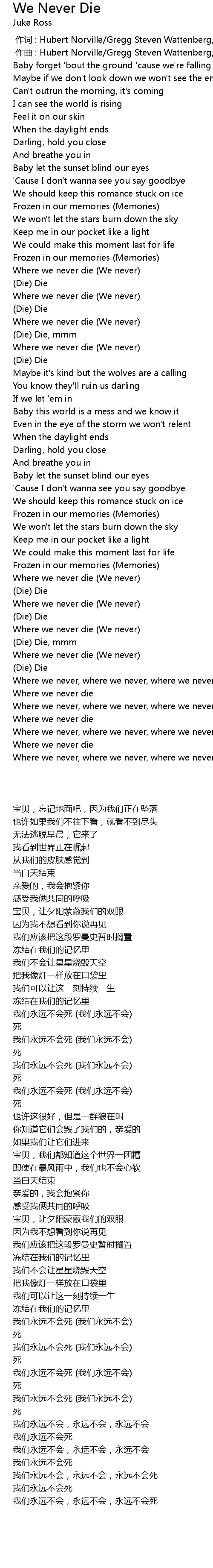 | [02:59.90] | Where we never, where we never, where we never Die |