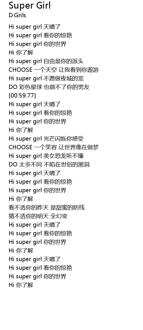 | [01:04.21] | Hi super girl 看你的惊艳 |