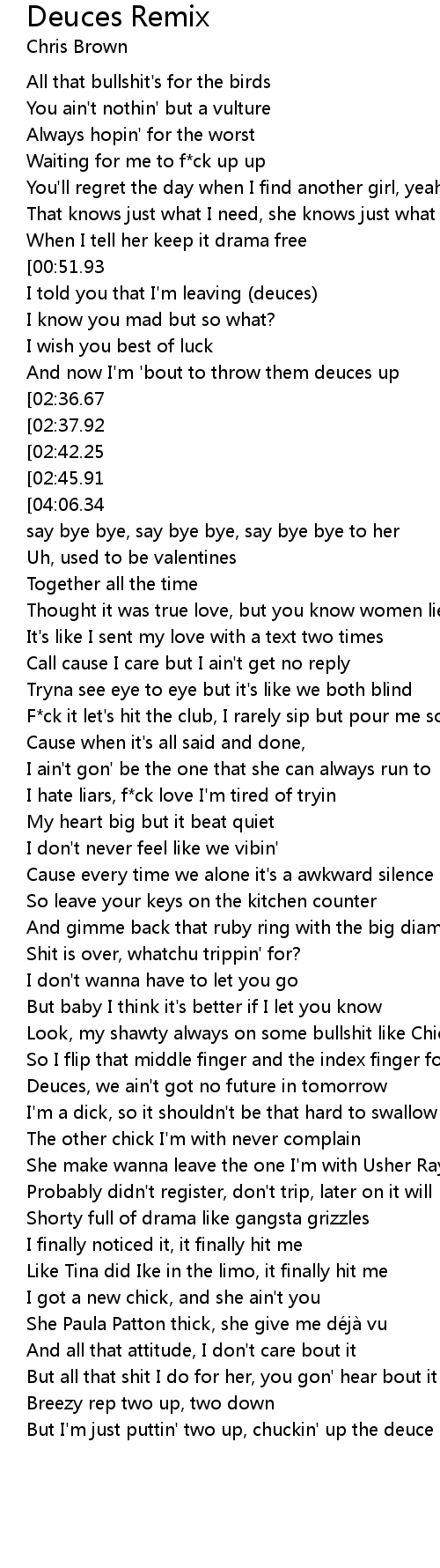 | [03:56.05][02:37.92][01:20.34] | I'm chuckin' my deuces up to her |
