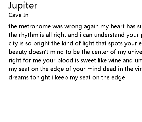the metronome was wrong again my heart has surely gone and skipped a beat now the rhythm is all right and i can understand your point of view jupiter this city is so bright the kind of light that spots your eyes with white jupiter your beauty doesn't mind to be the center of my universe jupiter you're seemingly so right for me your blood is sweet like wine and until i run out of vine i'll keep my seat on the edge of your mind dead in the vine of love well, visit me in my dreams tonight i keep my seat on the edge |