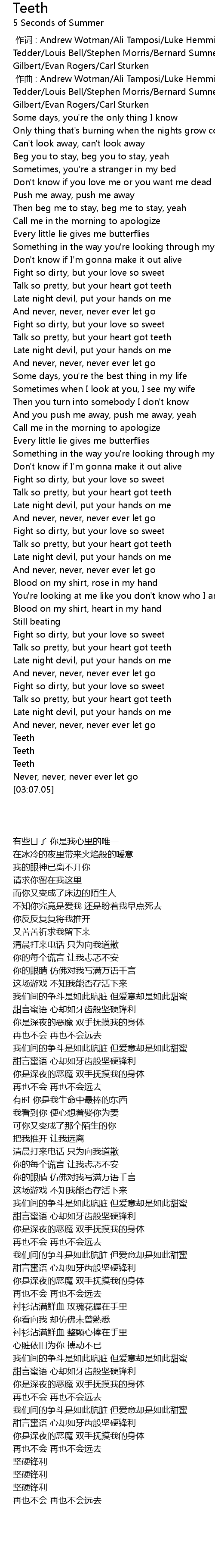 | [00:00.00] | 作词 : Andrew Wotman/Ali Tamposi/Luke Hemmings/Ashton Irwin/Ryan Tedder/Louis Bell/Stephen Morris/Bernard Sumner/Peter Hook/Gillian Lesley Gilbert/Evan Rogers/Carl Sturken |