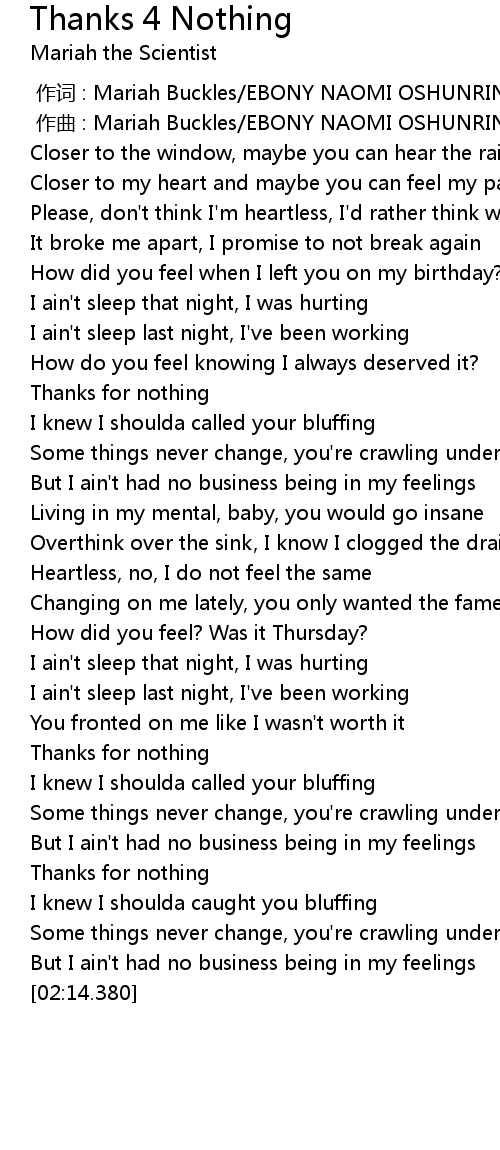 | [00:01.000] | zuo qu : Mariah Buckles EBONY NAOMI OSHUNRINDE |
