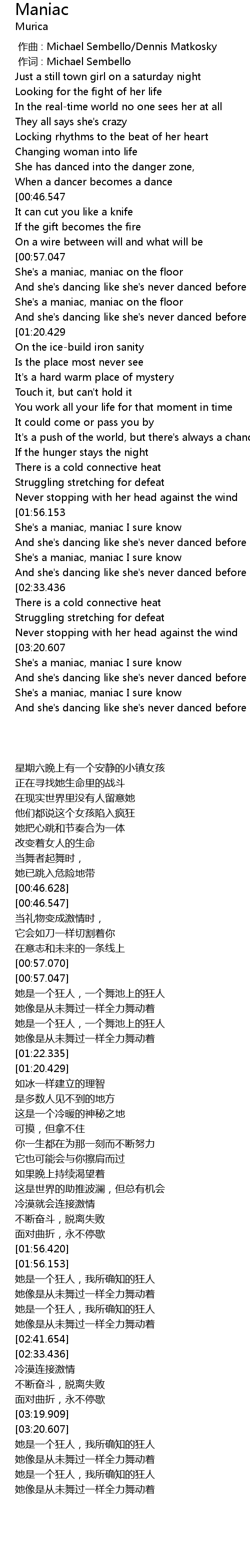 | [00:57.693] | She' s a maniac, maniac on the floor |