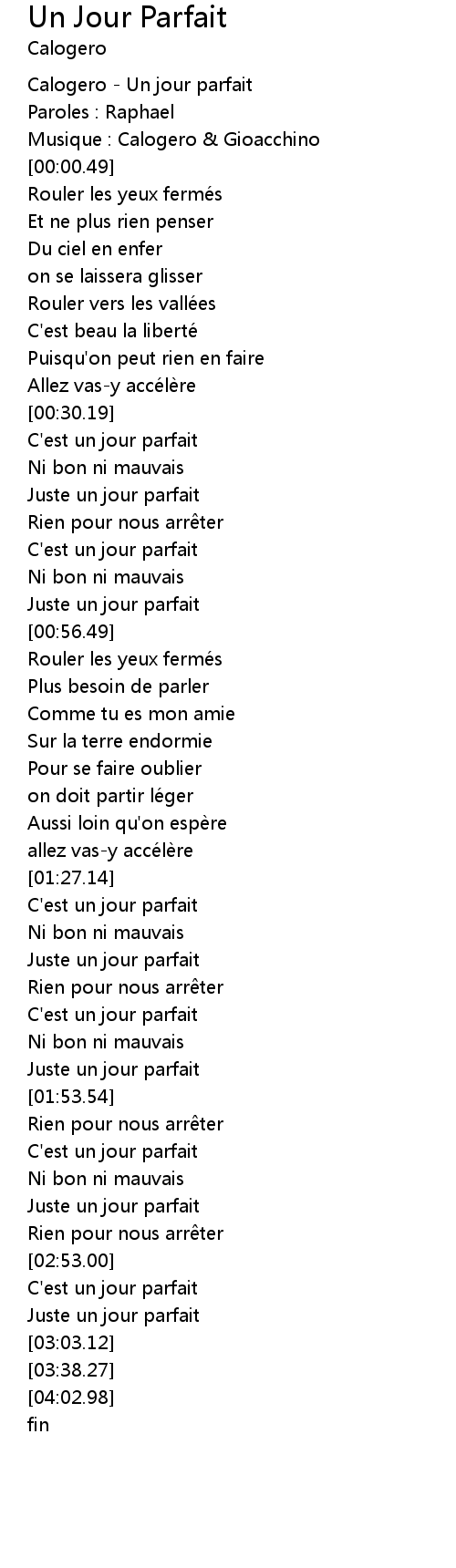 | [00:00.00] | Calogero - Un jour parfait |