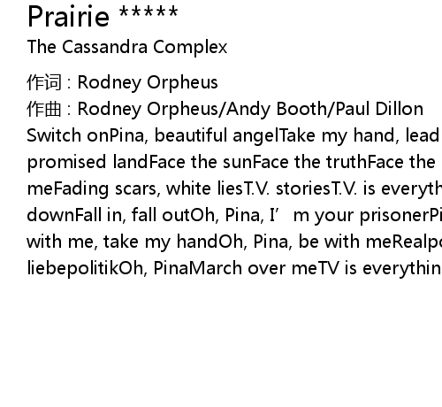 | Switch onPina, beautiful angelTake my hand, lead meAcross the sandTo the promised landFace the sunFace the truthFace the enemyOh, Pina, face the truth in meFading scars, white liesT.V. storiesT.V. is everythingI’m falling, falling downFall in, fall outOh, Pina, I’m your prisonerPina, beautiful alienDance with me, take my handOh, Pina, be with meRealpolitik, realpolitikLiebe, liebepolitikOh, PinaMarch over meTV is everything |