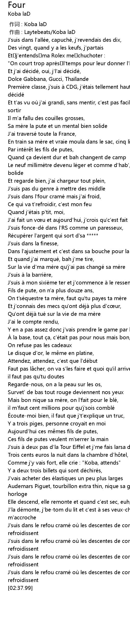 | [00:47.29] | Sa mère la pute et un mental bien solide |