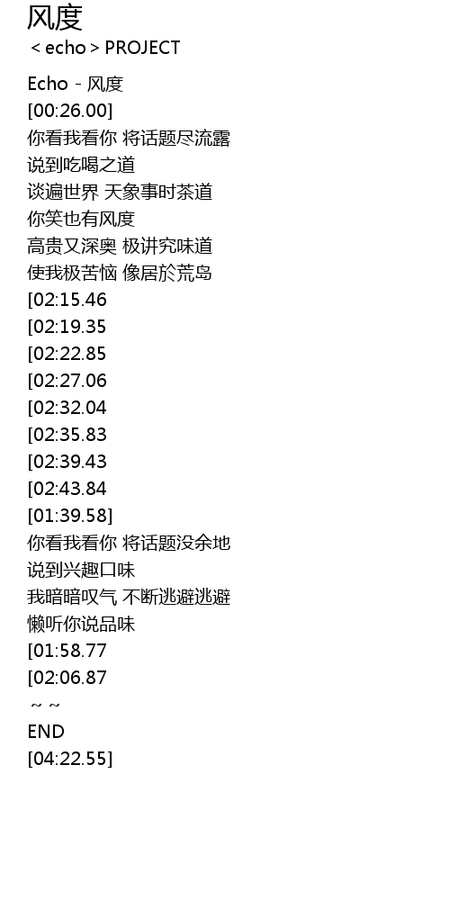| [03:40.82][02:15.46][01:06.64] | 可否抛去心内那一套 |