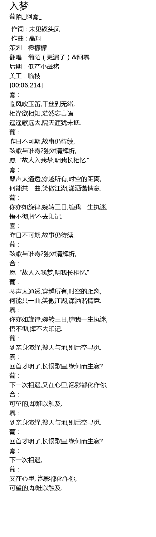 | [00:03.210] | 翻唱:葡陌(更漏子)&阿雾 |
