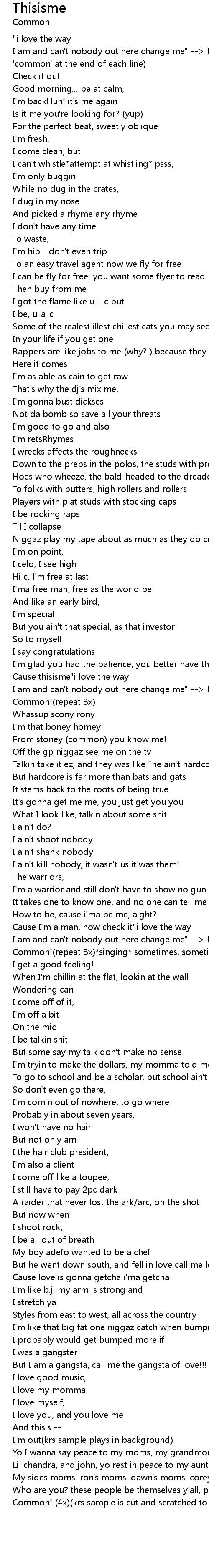 I am and can't nobody out here change me" --> krs-one(repeat 2x, then 2x with 'common' at the end of each line) |
