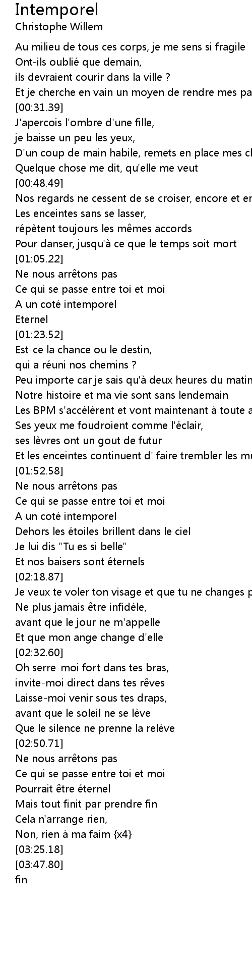 | [02:19.31] | Je veux te voler ton visage et que tu ne changes plus d'age |