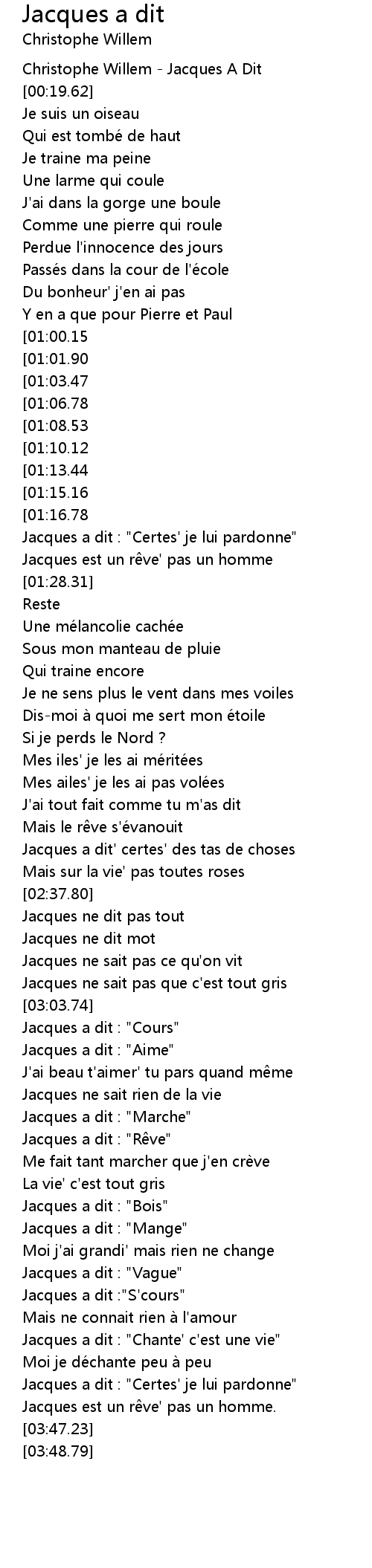 | [02:25.34][01:15.16] | Jacques a dit : "Rêve" |