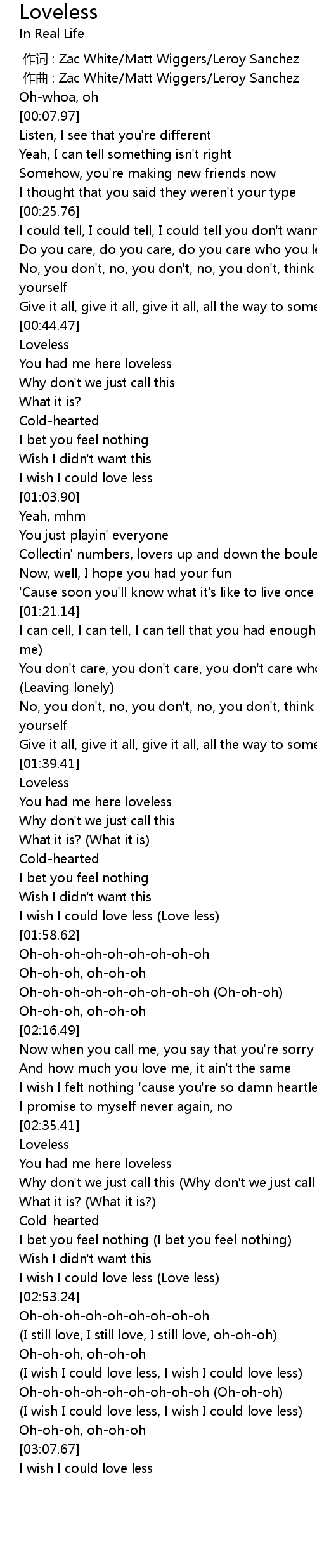 | [02:59.78] | (I wish I could love less, I wish I could love less) |