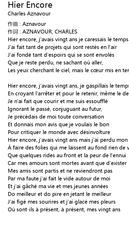 | Hier encore, j' avais vingt ans je caressais le temps | |