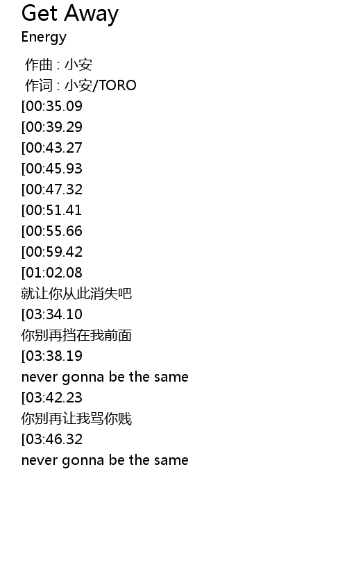 | [04:02.53][03:46.32][02:53.37][02:37.11][01:40.21][01:24.00] | You gotta get away never gonna be the same |