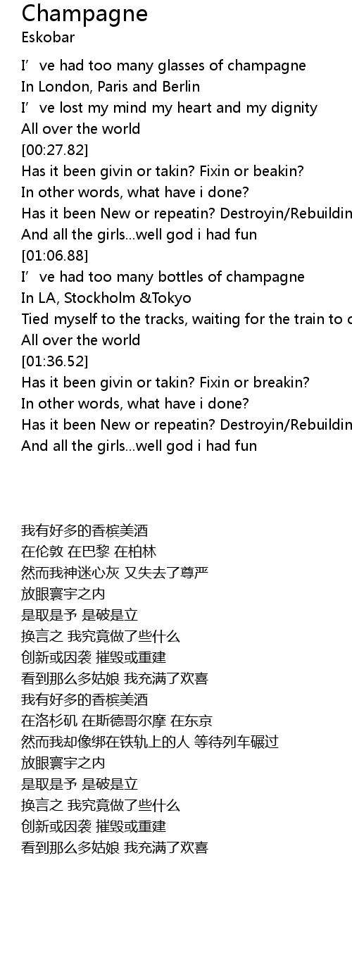 | [00:00.71] | 我有好多的香槟美酒 |