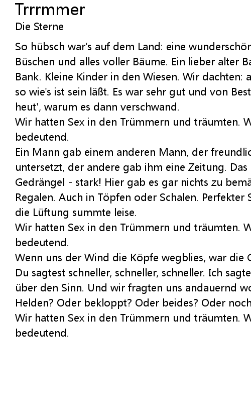 | Wir hatten Sex in den Trü mmern und tr umten. Wir fanden uns ganz sch n bedeutend. |