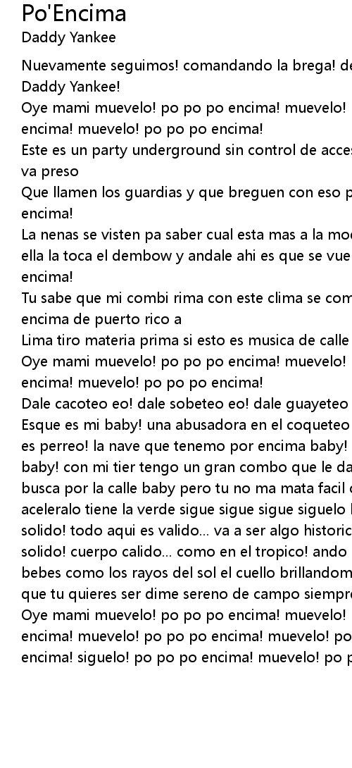 Oye mami muevelo! po po po encima! muevelo! po po po encima! siguelo! po po po encima! muevelo! po po po encima! muevelo! po po po encima! muevelo! po po po encima! siguelo! po po po encima! muevelo! po po po encima! |