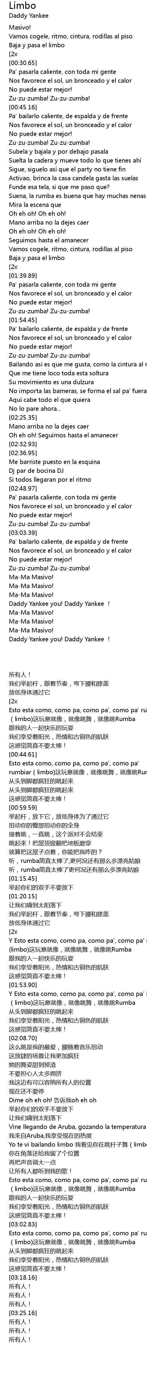 | [02:36.95] | Yo te vi bailando limbo 我看见你在跳杆子舞(limbo) |