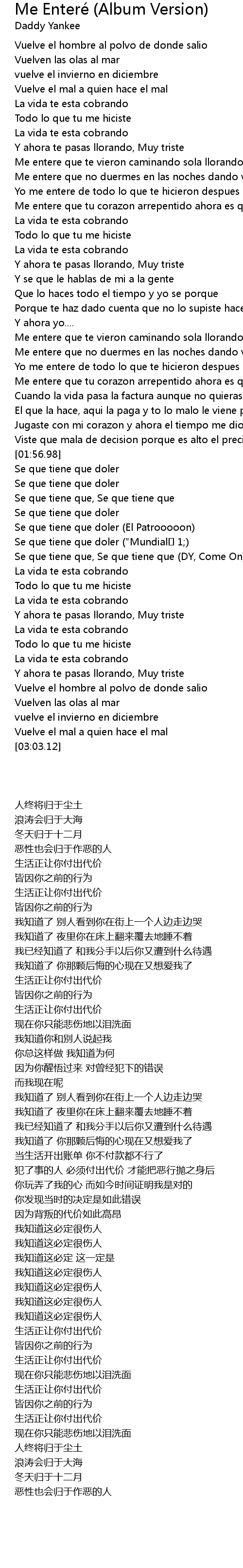 | [01:31.68] | Yo me entere de todo lo que te hicieron despues que tu me dejaste |