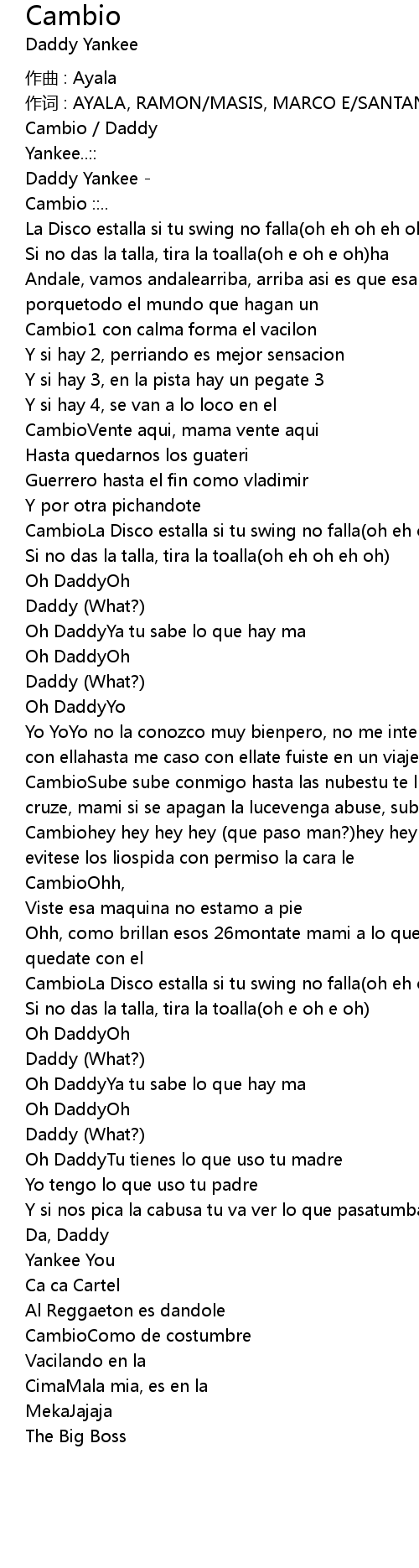 | Cambiohey hey hey hey (que paso man?)hey hey hey hey (What So Man?)hey tranquilo evitese los liospida con permiso la cara le | |
