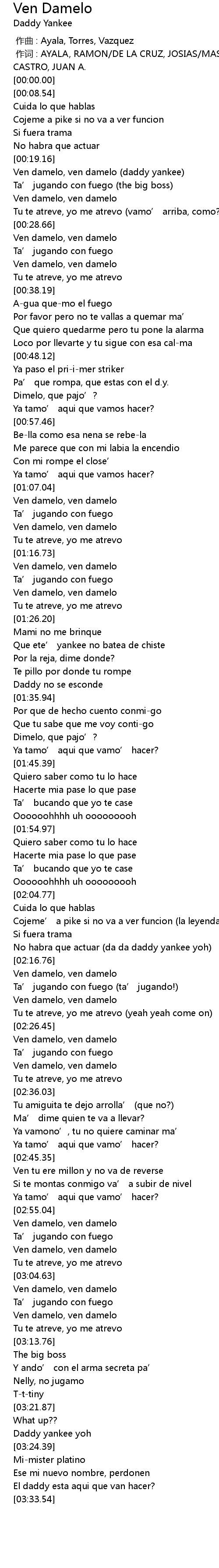 | [00:19.26] | Ven damelo, ven damelo (daddy yankee) |
