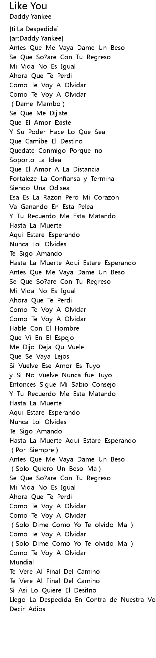 | [02:52.13] | (Solo Dime Como Yo Te olvido Ma ) |