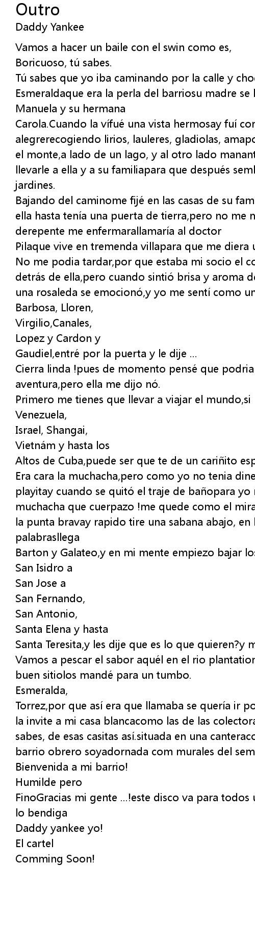 | Torrez, por que asi era que llamaba se queri a ir porque estaba molesta, pero yo la invite a mi casa blancacomo las de las colectoras de piedra, las pomas, tu sabes, de esas casitas asi. situada en una canteracontruida por mi mismopues del barrio obrero soyadornada com murales del sem y de borinqueny le dije: | |