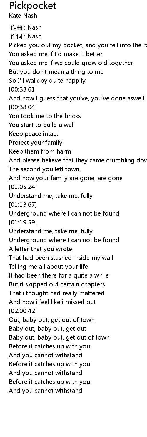 | [02:01.24] | Out, baby out, get out of town |
