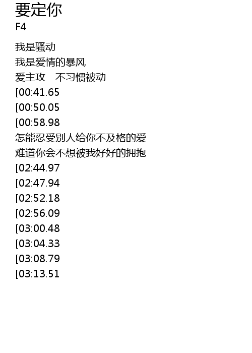 | [03:37.05][03:00.48][01:34.40] | 要定你 爱定你 |