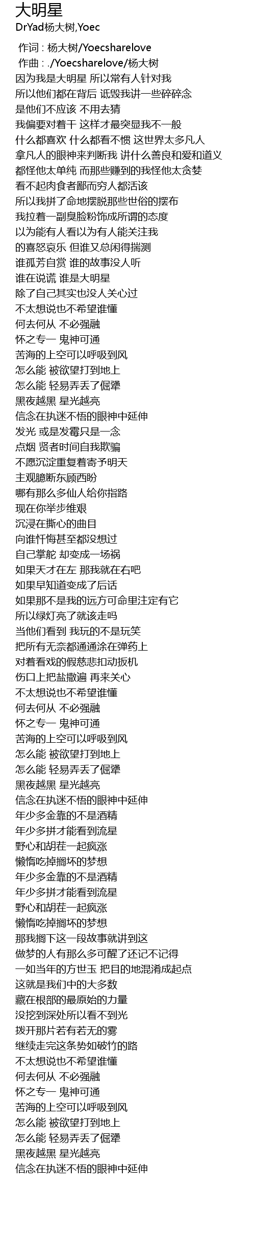 | [00:00.000] | 作词 : 杨大树/Yoecsharelove |