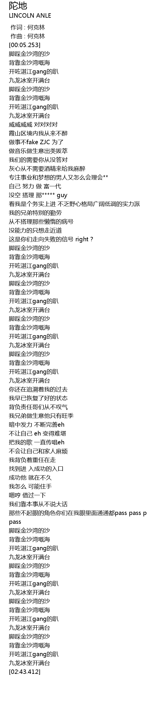 | [02:39.403] | kai zuo zhan jiang gang de pa |
